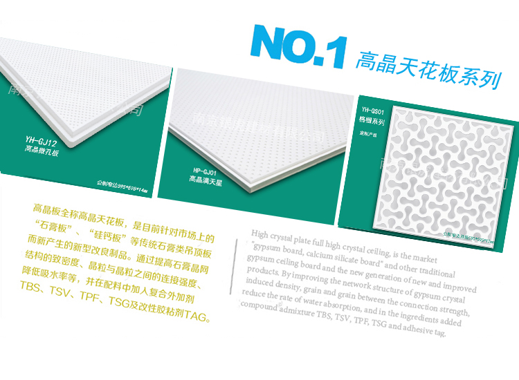 高晶天花板是一種(輕質(zhì)高強(qiáng))吊頂材料,是目前普通硅鈣天花強(qiáng)度的(2-3)倍,高晶天花采用(純天然)晶體質(zhì)石膏,(純天然)無機(jī)復(fù)合材料制成,無放射性,無任何有害物質(zhì)與公害氣體,在水化