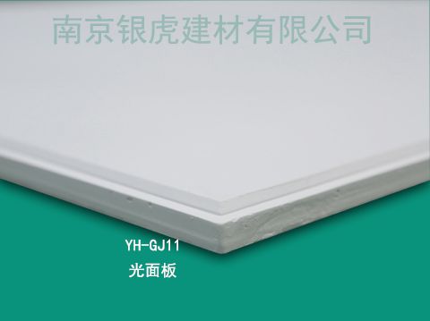 此花型名稱為“光面板”表面無花型。常規尺寸595*595*14mm/600*1200*15mm(公制)。光面板擁有柔美的板面,頗具個性的黑線(或藍線)鋁合金龍骨襯托,能使空間很有層次感,都達到近乎完美的境界。 板面與龍骨相平,乳白色的板面,光亮照人,細膩而柔和的色澤,讓裝飾效果清爽而高雅。銀虎”牌天花板擁有獨特性、高密性的原材料配方及環保節能技術,使銀虎天花板引領吊頂材料的新潮流。“銀虎”牌高晶(硅鈣)復合天花板徹底解決了傳統天花吊頂材料變形、變黃、發霉、易污臟、粗糙、檔次低等通病與缺點,產品不僅具有防火、防水、防霉、高強、輕質、吸聲除噪、耐候抗老化、風化等優良的質量性能,而且裝飾效果美觀精致、靚麗高雅。
