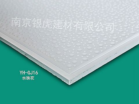 此花型名稱為“水珠花”常規尺寸603*603*14mm(公制)銀虎”牌天花板擁有獨特性、高密性的原材料配方及環保節能技術,使銀虎天花板引領吊頂材料的新潮流。“銀虎”牌高晶(硅鈣)復合天花板徹底解決了傳統天花吊頂材料變形、變黃、發霉、易污臟、粗糙、檔次低等通病與缺點,產品不僅具有防火、防水、防霉、高強、輕質、吸聲除噪、耐候抗老化、風化等優良的質量性能,而且裝飾效果美觀精致、靚麗高雅。